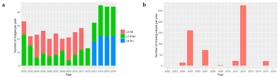 Landsat data availability covering the study area during 2002–2016. (a) Number of Landsat 5, 7 and 8 images per year; (b) Number of missing values in all Landsat images per year over the study period.