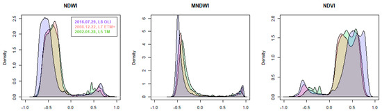 All available Landsat images during 2002–2016 from three different sensors were used in this study. However, the comparison of different sensors (i.e., Landsat 5 TM, Landsat 7 ETM+ and Landsat 8 OLI) was not implemented in this study. It should be noted that they do have small difference in the performances of surface water extraction using spectral indices [38,58].