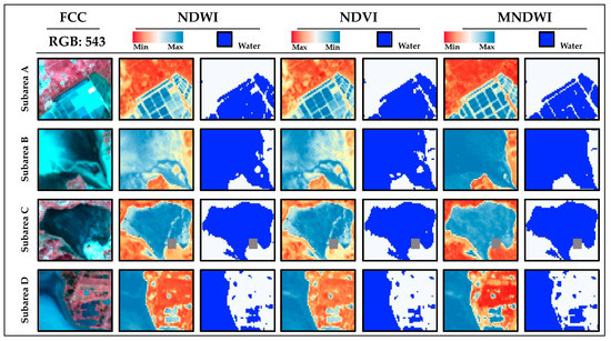 In order to fully compare the spectral indices used in this study and select the optimal one for further analysis of surface water dynamic, we both qualitatively and quantitatively evaluated the results of the index-based approaches. We first compared the results of water indices with the false color composite (FCC) of the initial Landsat bands in the different areas of interest. The sub-areas were selected to perform comparisons where different patterns of water patch and vegetation disturbance were present. More precisely, the subareas A, B, C and D represent an artificial saltpan, the lagoon estuary with submerged marine vegetation, a small lagoon, and the natural wetlands with irregular borders of surface water, respectively. Their spatial localization was displayed in Figure 1.