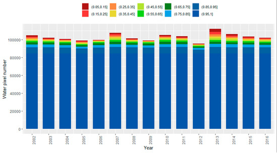 Distribution of pixel number of ten water frequency levels for each year during 2002–2016.