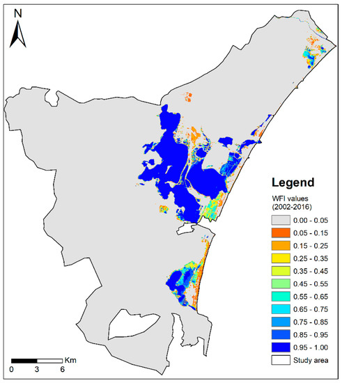 Figure 6 presents the WFI map for the entire time period of 2002–2016. During such period, the spatial distribution of PW, NPW and NW had a consistent pattern. More precisely, PW class (i.e., high water frequencies with the values greater than 0.75) often occurred in lagoons of different sizes that were located in the upper, central and lower areas of the study area. Low water frequencies (i.e., 0.05 < WFI < 0.75) (i.e., NPW class) often located around the lagoons or near the Mediterranean Sea. Those grey areas with WFI values between 0 and 0.05 represented the NW class.