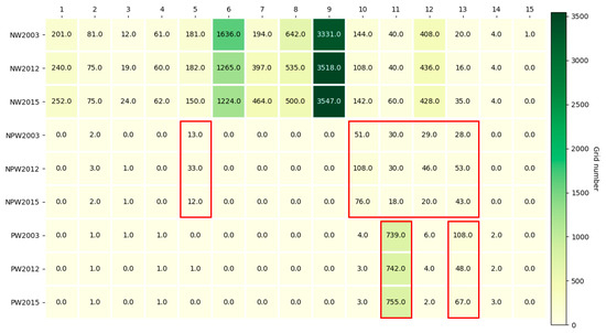 Heatmap of the number of cells having the same relationship of the matchup between LULC types and surface water scenarios for 2003, 2012 and 2015. The x-axis represents the number of different LULC types, and the y-axis represents the water-related classes in three different years.