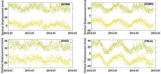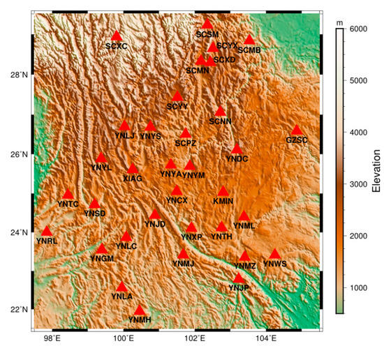 The frequent seismic activities and other geological hazards necessitate the installation of 34 continuous GPS observation stations in southwest China, affiliated with CMONOC of China (Figure 1) [38]. The GPS VCD data could be accessed via http://www.cgps.ac.cn/. Most continuous GPS stations in the study region have been initiated since 2010, except the KMIN and XIAG stations, which have been operated since 1999. The variable trends and gross errors in VCD were presented for the first two years of observations. Therefore, the time series of all GPS stations spanning between January 2012 and October 2014 were utilized in this study.