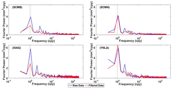 The GPS Fourier power spectra of the unfiltered (blue) and filtered (red) time series for four selected GPS stations (i.e., SCMB, SCMN, XIAG, and YNLA).