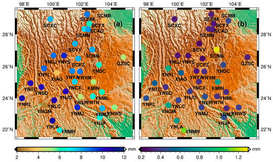 Distribution of (a) the annual amplitude and (b) its standard deviation (in mm) of the 34 GPS stations on a topographic base map.