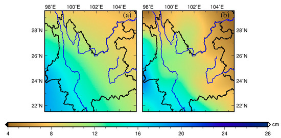Southwest China (Figure 1), covering the entire Yunnan and Guizhou provinces and part of the southeastern Tibetan Plateau, is situated at the upstream area of the Lancang River (also called Mekong River outside China), Yangtze River, and Pearl River. This region is climate-driven and affected by the Indian monsoon [33]. Its altitude ranges from 1500 to 4000 m. A bare karst geology is located at the eastern part of the study region, with low-permeability rocks surrounded by high-permeability ones. This causes water to infiltrate quickly into the ground, which results in a surface water deficit [31]. In addition, half a billion people live in the mid- and downstream areas of the above river basins, which are vulnerable to hydrological extremes occurring in the upstream area [34,35,36]. The hydrological extremes in the upstream area threaten the agriculture, living environments, and the economy in the mid- and the downstream areas whether within China or her transboundary river basins. This indicates that the large-scale monitoring of TWS is essential for sustainable agricultural practices, water supply, and for the notification of extreme events within the region. The geographic environment and its apparent seasonal characteristics (as manifested from the apparent seasonal signals in GPS VCD in Figure 8 of [37]) in this region lay out a good environmental setting for the study.