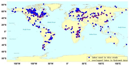 Global lakes (area greater than 500 km2 and elevation lower than 3000 m each) used for water level retrieval in this study. There are 351 lakes (blue solid circles), with 284 in the Northern hemisphere and 67 in the Southern hemisphere. Red solid triangles represent the overlapped 89 lakes in the Hydroweb data. All the lakes are overlapped with the Cryosat-2 data.