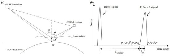 Principle of lake water level measurement using TechDemoSat-1 (TDS-1) data. (a) Geometry of lake water level measurement. The solid reflected line minus the direct path is , and the dotted reflected line minus the direct path is ; (b) calculation of the observed time delay.  represents the delay of the delay-Doppler map (DDM) window and  represents the delay of the specular point within the DDM window.