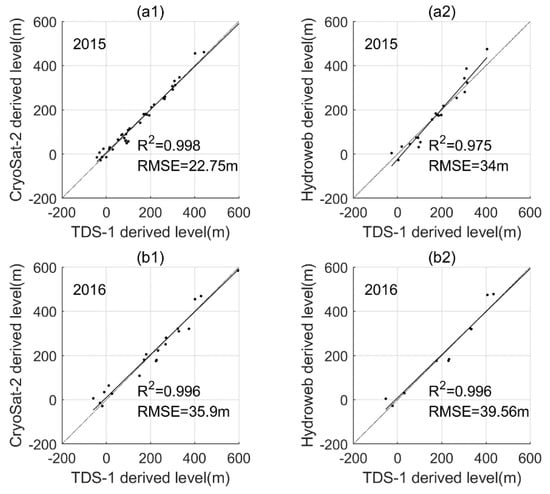 Correlations of TDS-derived lake level with that from CryoSat-2 and Hydroweb data during the summers of 2015 and 2016. (a1) TDS-1 vs CryoSat-2 in 2015; (a2) TDS-1 vs Hydroweb in 2015; (b1) TDS-1 vs CryoSat-2 in 2016; (b2) TDS-1 vs Hydroweb in 2016.