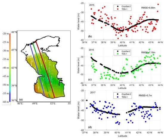 Spatial distributions of water level with respect to WGS84 ellipsoid over the Caspian Sea. (a) Map of three TDS-1 tracks for the Caspian Sea from 06/07/2015 (red), 08/08/2016 (green), and 06/11/2017 (blue), respectively. The background map shows the spatial variations of water levels observed by CryoSat-2 in 2015; (b–d) spatial variations of water levels observed by the corresponding TDS-1 tracks in (a), with CryoSat-2 derived water levels of the same year as a contrast.