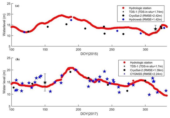 Water level changes of the Poyang Lake observed by (a) TDS-1, CryoSat-2, Hydroweb, and the hydrologic station in 2015, and (b) TDS-1, CryoSat-2, and the hydrologic station in 2017.