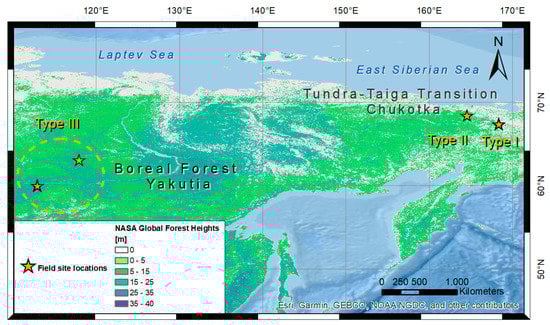 Arctic biomes are projected to change dramatically due to global warming, which is amplified in the polar regions [,], while interactions between boreal forests and the atmosphere are influencing the global climate via a positive feedback loop [,]. These changes can be primarily observed at biome transitions, among which the tundra–taiga ecotone (also called forest tundra or tundra–taiga transition zone) is the most prominent in the northern hemisphere stretching over more than 1.9 million km2 []. The tundra–taiga ecotone is the transition zone between dense boreal forest and treeless tundra. Here, warming temperatures lead to a shrubification of the tundra, latitudinal northward and altitudinal upward transition of the treeline [], and a densification of existing forest stands [,]. To predict potential changes for the treeline, models can be made to simulate this process [,]. However, crucial field data for validation is scarce from these remote study areas, since the region is vast, the infrastructure poor, and the vegetation period only very short.