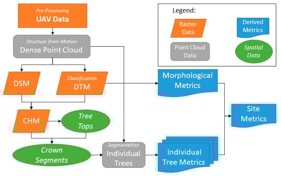 Processing chain from pre-processed Unmanned Aerial Vehicle (UAV) data to site metrics. Abbreviations: UAV = Unmanned Aerial Vehicle, DSM = Digital Surface Model, DTM = Digital Terrain Model, CHM = Canopy Height Model.
