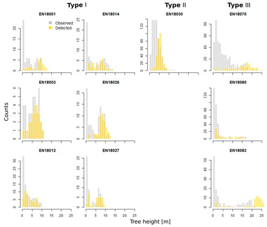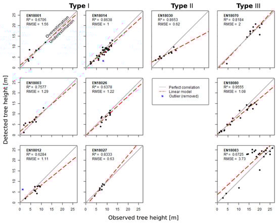 We detected between 49% and 100% (mean = 74.8%, total detection rate of 67.1%) of the individual trees in each surveyed site. Typically, trees that the detection method failed to recognize were smaller than 2.5 m, but, depending on the stand structure, exceptions up to 12 m occurred as well (Table 4). Tall undetected trees stood either very close to or under a neighboring tree. Linear regressions of observed versus detected tree heights had a mean coefficient of determination (R2) value of 0.77 with the highest mean correlation in Type II ( N = 1), followed by Type III (, N = 4), and lowest in Type I (, N = 6). We removed an outlier in two cases (EN18012/14), where almost horizontally leaning trees were surveyed.