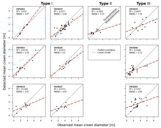 The observed crown diameters are weakly correlated with the detected crown diameters (mean R2 = 0.46, mean RMSE = 0.67 m, mean RMSE% = 24.9%) and show a high inter-type variability (Figure 5). Type III has a very low mean R2 of 0.24, with no clear trend towards under- or over-estimation, whereas crown diameters of Type I sites are correlated more strongly than the average ( = 0.56).