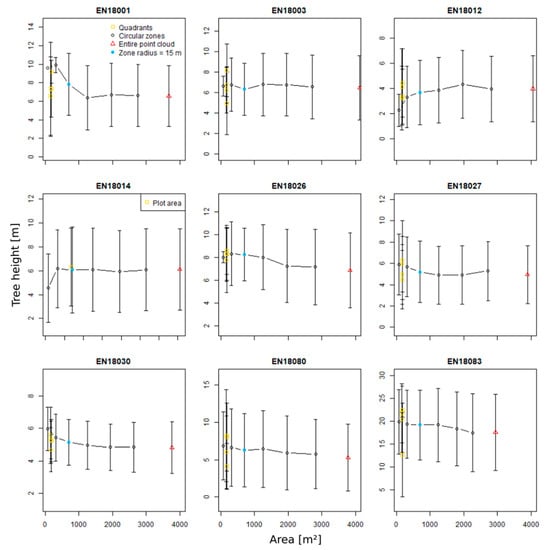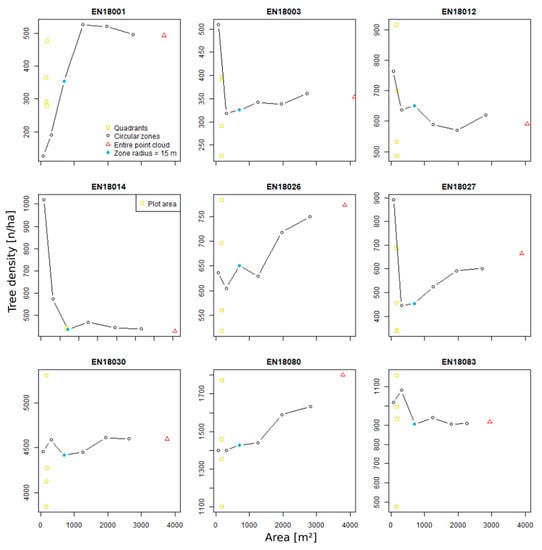 Tree density of sites EN18026/80 does not converge at all within their point cloud extent. EN18001/12/27 densities converge outside the 15 m buffer radius zone. The remaining sites EN18003/14/30/83 converge at smaller radii than 15 m. The mean tree height is spatially more stable and generally converges before the 15 m or even 10 m radius (Figure 8). The only exception is EN18001, where the mean tree height only stabilizes in the 20 m buffer zone.