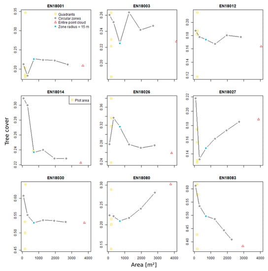 Tree cover (fraction of ground covered by tree crown area) is the most heterogeneous of the studied metrics and often converges at large areas or not at all, indicating a heterogeneous stand structure.