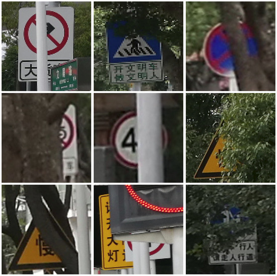 Traffic signs are an important kind of transportation facility that present traffic information, such as speed and driver behavior restrictions, road changes ahead, and so forth. A driver’s timely visual recognition of traffic signs is critical to ensure safe driving and to avoid accidents [1,2,3]. However, traffic signs are often partially contaminated due to damage, occlusion, or installed in an unreasonable position, thereby decreasing visual recognition. Figure 1 illustrates some examples of traffic signs with low visibility caused by object/plants occlusion. Maintenance and optimization of the existing infrastructure is a major work for road network management. The most difficult aspect for an engineer is knowing which traffic signs should be repaired efficiently and when. How to accurately and efficiently evaluate the visibility and recognizability of traffic signs in a large-scale traffic environment is a challenging problem.