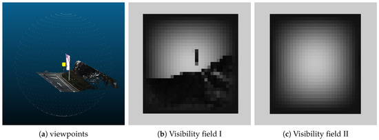 The visibility field reflects the visible distribution around a target object in 3D space. Take a traffic sign as an example. The visibility field of its hemispherical space is shown in Figure 3. The traffic sign (yellow) and distribution of its viewpoints (white points) are shown in Figure 3a. In Figure 3b,c, the color of the pixels changing from black to white, means that, the value of viewpoint visibility change from small to big. Figure 3b shows the visibility field of the traffic sign with occlusion. Figure 3c shows the visibility field of the traffic sign without occlusion.