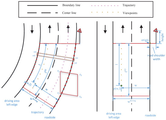 After detecting road markings, we obtain the left and right solid road marking lines in driving area for a traffic sign. In paper Yu et al. [48], the correctness of detection road marking reaches . If a solid line is not continuous, or is partially missing because of low reflectivity, to complete it, we use its attribute that it approximately parallels the trajectory line. If road markings are totally mis-detected, we first subtract the height of the MLS device from the trajectory to obtain a trajectory on the road. Then, the right solid road marking line, is obtained, by moving the trajectory on the road to the right edge of the road according to the traffic sign position in standard road design; the left solid road marking line, is obtained, by moving the trajectory on the road to the left according the default number of lanes.