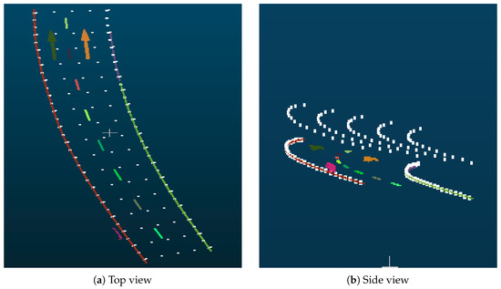 For two adjacent points in each edge, we use interpolation or sampling method to insert or sample any number of points at will, meanwhile, ensure that the number of points in left and right edges is equal for the convenience fo calculation. Observation height is added to each point in the two edges. For each pair points, coming from the left and edges separately and have the same index in each edge, we use interpolation method to insert any number of points at will. The observation height is usually set at 1.2 m above the road surface [56]. Shown in Figure 5 are the results of the calculated viewpoints.