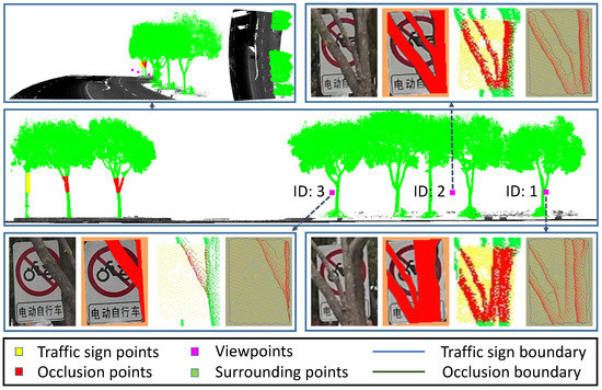 From the vertexes of boundary of the projected traffic sign panel point cloud, we select a vertex which has the maximum distance from its center (origin) to the vertexes. Rotating the line segment from viewpoint to the selected vertex around the axis form viewpoint to origin, we get a vertebral body. The points which possible occlude the traffic sign are included in the vertebral body. We segment points in the vertebral body from traffic sign surrounding point clouds by two conditions: (1) the angle between the vector from viewpoint to the point and the vector form viewpoint to origin, is less than, the angle between the vector from viewpoint to the selected vertex and the vector from viewpoint to origin; (2) the distance from viewpoint to the point, is less than, the distance from viewpoint to the selected vertex.