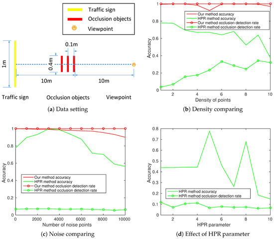 Point clouds-based methods. Katz et al. [21] proposed a Hidden Point Removal (HPR) operator to obtain visible points from a given viewpoint, applied it to improving the visual comprehension of point sets [22] and studied the transformation function of the HPR operator [23]. Huang et al. [24], based on the HPR operator, studied traffic sign occlusion detection from a point cloud. They considered occluded distribution and an occlusion gradient.