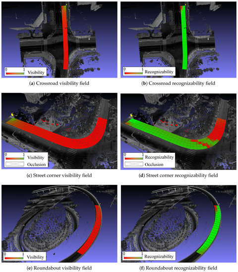 Existing research on the evaluation of traffic sign visibility and recognizability is based mainly on simulator and image methods and naturalistic driving experimentation. Simulator based methods [8,9,10] cannot evaluate the visibility and recognizability of real roads. Image based methods [11,12,13] are limited by fixed viewpoints and cannot evaluate the visibility and recognizability over the whole road surface. Naturalistic driving experimentation based methods [14,15] cannot obtain recognizability at a given position on a road surface. So far, there is no solution available to evaluate the recognizability distribution of traffic signs in a real traffic environment.