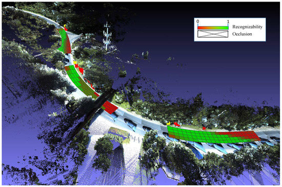 The inputs of the TSVREM Model are the road point clouds and the trajectory of MLS. The outputs are visibility field, recognizability field and traffic sign visual recognizability. First, we detect and classify the traffic signs and road markings using References [31,48], respectively. The thresholds or parameters used to extract traffic signs and road markings are consistent with the original paper. For example, when extracting traffic signs, the threshold of reflectance intensity is greater than 60,000 and the eigenvalues satisfy the following condition: and . Second, we segment the traffic sign surrounding point clouds and remove the outliers points [54]. The traffic sign surrounding point clouds are the point clouds on the right (or left) side above the roadway in front of a traffic sign within the SD distance. Then, we select viewpoints from road marking point clouds. Finally, using the traffic sign panel point cloud, the traffic sign surrounding point clouds and the viewpoint together, we compute viewpoint visibility, viewpoint recognizability, traffic sign recognizability and output occluding points. The algorithm is summarized in Algorithm 1.