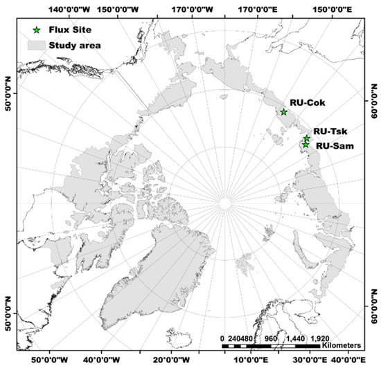 Spatial extent of the tundra region of the study. The green pentagrams denote the eddy-covariance (EC) flux sites within the study area.