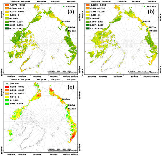 For the spatial pattern of Arctic tundra greenness, the annual trends (2007–2013) of the NDVIs and SIF were calculated by least square regression using the Google Earth Engine platform []. The trends were checked using the annual maximum values of the NDVIs and SIF, not just within the growing season. This not only avoided a lack of temporal information, but also made more biological sense for the relationship between greenness and vegetation growth []. The slope coefficient obtained from the regression line was used to describe the greenness trend.
