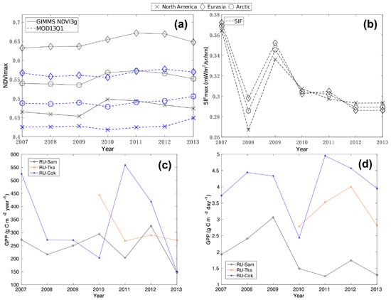 Arctic tundra greenness (average of the annual maximum value) and EC-observed gross primary production (GPP) from 2007 to 2013. (a) GIMMS NDVI3g, MOD13Q1, (b) SIF, (c) annual GPP, and (d) maximum value of monthly GPP.