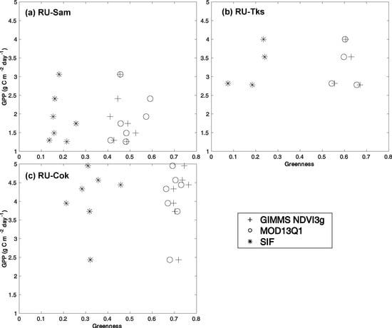 Comparison between the tundra greenness (GIMMS NDVI3g, MOD13Q1 and SIF) and the maximum value of monthly GPP derived from (a) RU-Sam, (b) RU-Tks, and (c) RU-Cok. The greenness was calculated as the 3 pixel × 3 pixel average value around the EC flux tower for each year. For more details about EC flux sites, see Table 2.