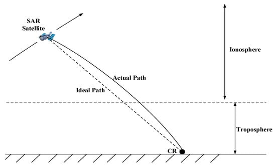 When the radar system is working, radar signals travel between the antenna and ground. Because the refractive index of the atmosphere is not uniform, the radar signal encounters group delay (Figure 1), known as atmospheric path delay, in both the ionosphere and troposphere [20,21]. The atmospheric path delay is responsible for measurement errors of several meters in the SAR slant range. For the SAR image signal, the atmospheric path delay is given by