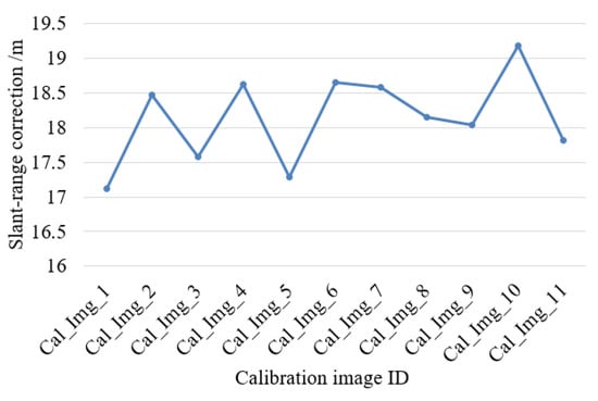 As can be seen from Figure 2, the geometric calibration errors cause differences in the slant-range corrections obtained using different calibration images, and the difference between the minimum and maximum correction values is more than 2 m. Therefore, to improve the stability of the geometric calibration parameters, multiple images can be combined for calibration and used to achieve a stable solution for the geometric calibration parameters.