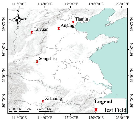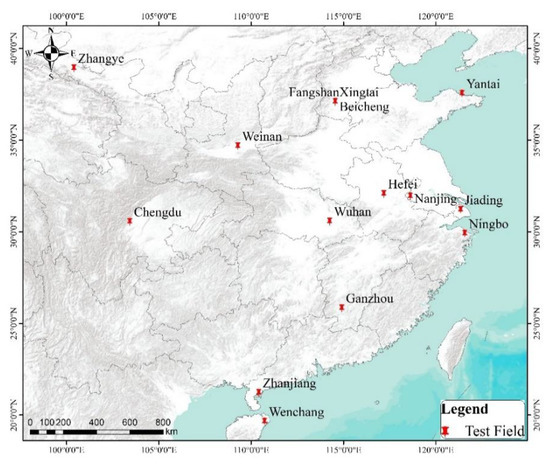 Distribution of the fifteen periodic test fields for Yaogan-13 in China.