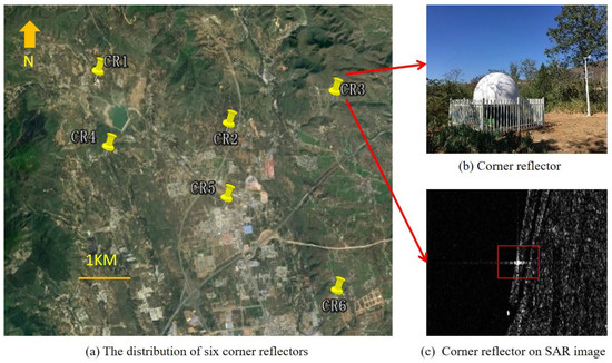 Songshan test field [24]. (a) The distribution of six corner reflectors; (b) Corner reflector; (c) Corner reflector on SAR image.