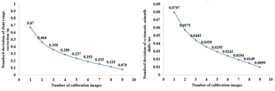 As can be seen from Figure 7, the standard deviations of the slant-range corrections and systematic azimuth shifts decreases as the number of calibration images involved in the geometric calibration increases (i.e., the calibration result is more stable).