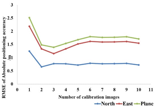 Variations in the root-mean-square error (RMSE) of the absolute positioning accuracy (north, east, and plane) computed on independent checkpoints (ICPs) with the number of calibration images.