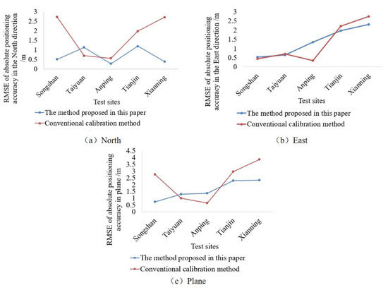 Comparison of the conventional geometric calibration method with the method proposed in this paper. (a) North; (b) East; (c) Plane.
