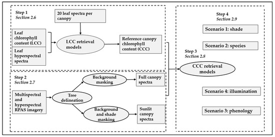 Our workflow to retrieve canopy chlorophyll content from airborne multispectral and hyperspectral RPAS data comprised four steps (Figure 2). First, a species-independent leaf chlorophyll model was developed and applied to the leaf spectra, taken from each tree (Section 2.6). This gave us the reference CCC per individual tree. Second, individual canopies were detected, delineated, and masked for either background or background and shade from the RPAS imagery (Section 2.7). Third, the spectral information of each tree segment was extracted from the RPAS imagery to estimate the CCC with CCC retrieval models (Section 2.8). Fourth, the CCC retrieval model sensitivity was assessed under different scenarios of confounding factors (Section 2.9).