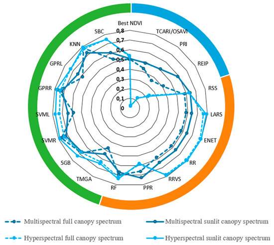 Univariate (blue) and multivariate linear (orange), as well as non-linear (green) retrieval model accuracy in R2 of CCC retrieval for both hyperspectral and multispectral image data with the use of the full and sunlit canopy spectra. Abbreviations of the models: RSS = regression with stepwise selection, LARS = least angle regression, ENET = elastic net regularization, RR = ridge regression, RRVS = ridge regression with variable selection, PPR = projection pursuit regression, RF = random forest, TMGA = tree models from genetic algorithms, SGB = stochastic gradient boosting, SVMR = support vector machines with radial basis function kernel, SVML = support vector machines with linear basis function kernel, GPRR = gaussian process regression with radial basis function kernel, GPRL = gaussian process regression with linear basis function kernel, KNN = K-nearest neighbors, SBC = subtractive clustering and fuzzy c-means rules