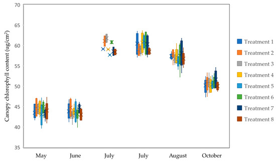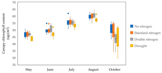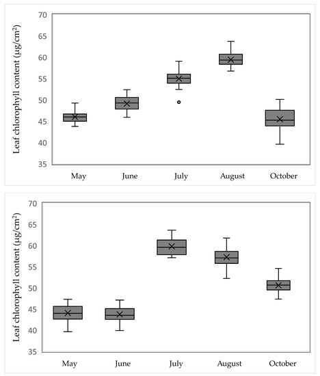 To our knowledge absolute numbers of CCC differences between fruit trees and over the full growing season have never been reported for a relatively large sample of fruit trees. In addition, we want to see if our results can be supported with the body of knowledge regarding fruit tree phenology and physiology. CCC differences between trees within one month provide insight into the physiological performance, while CCC differences from one month to the other offer information on tree phenology [71]. As leaves mature, chlorophyll accumulates in the leaves from May until July or August (Figure 4). The increase in CCC from June until July for Golden Delicious was also observed by Prsa et al. (2007) [4]. The sharpness of the peak in July was dependent on tree nitrogen status, the lower the nitrogen fertilization, the steeper the peak in July [4] and thus the steeper the fall of CCC in August.