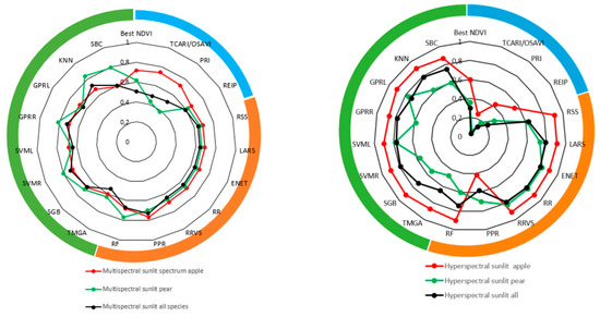 Univariate (blue) and multivariate linear (orange) and non-linear (green) retrieval model accuracy in R2 for CCC retrieval for multispectral (left) and hyperspectral (right) image data with the use of the sunlit canopy spectra of apple, pear and both species combined. Abbreviations of the models: RSS = regression with stepwise selection, LARS = least angle regression, ENET = elastic net regularization, RR = ridge regression, RRVS = ridge regression with variable selection, PPR = projection pursuit regression, RF = random forest, TMGA = tree models from genetic algorithms, SGB = stochastic gradient boosting, SVMR = support vector machines with radial basis function kernel, SVML = support vector machines with linear basis function kernel, GPRR = gaussian process regression with radial basis function kernel, GPRL = gaussian process regression with linear basis function kernel, KNN = K-nearest neighbors, SBC = subtractive clustering and fuzzy c-means rules.