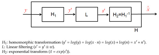 The signal y faces, at first, a homomorphic transformation, given by the logarithm function, which aims to convert the multiplicative speckle noise to an additive noise n′. Thus, we obtain a signal y′ defined as a summation between a noise-free signal x′ and a noise quantity n′ in the logarithmic domain. Next, y′ undergoes into a linear filtering L, described as a convolution with the Wiener kernel w, in order to achieve a filtered output s′. Finally, the latter returns to the initial domain using the exponential transform. The procedure is sketched in Figure 1.