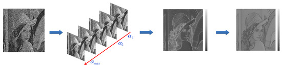 The processing steps of the proposed framework are illustrated in Figure 3 by referring to the well-known Lena picture. The image is affected by speckle noise. The first step involves the homomorphic transformation of the noisy image. Then, in the second step, we apply the Wiener filtering based on the modified kernel W′ using K different parameters of vector . Hence, this results in the generation of K filtered images. For each obtained filtered image, we estimate the using Equation (7), and we merge them by averaging them in order to achieve a single image. Then, the is obtained by inverting the merged output. Finally, we construct our final filtered output image by selecting each pixel from one of the K solutions based on the value presented in the .