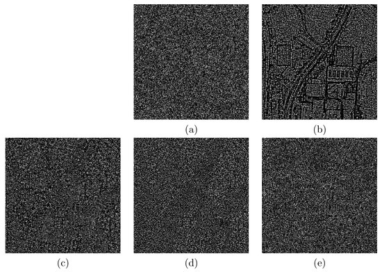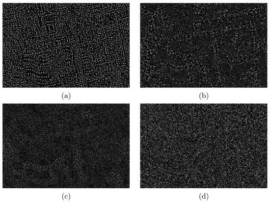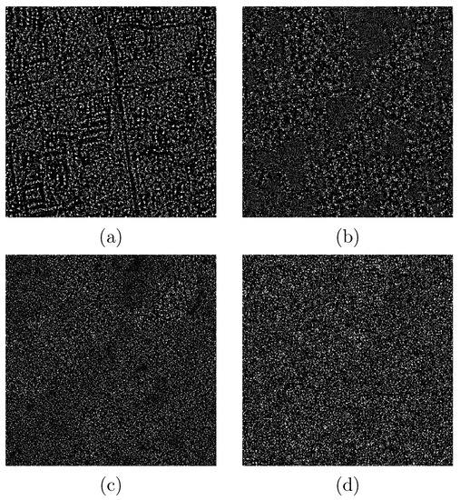 Based on Equation (7), if a pixel belongs to a homogeneous area, then will be small. On the contrary, if a pixel belongs to an edge, will be large. Such a feature of can be used to improve the efficiency of WF. The map provides the information about the probability that two pixels have the same values.