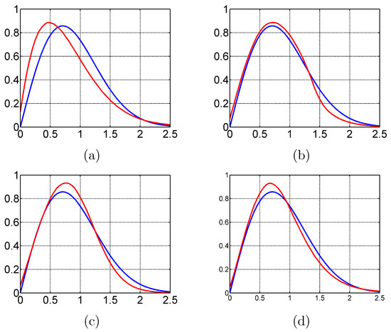 Chicago test case. Overlapping of the theoretical speckle PDF (blue line) and the one related to ratio images in amplitude format in the case of: (a) Kuan, (b) PPB-it, (c) FANS, and (d) EWF.