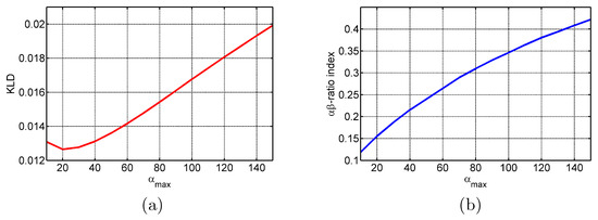Next, we must select the suitable parameters for our developed solution in order to achieve its highest performance on despeckling simulated Rome data. For that, we detected the optimal that corresponded to the lowest KLD and -ratio index values. Therefore, Figure 6 reports the evolution of both the KLD and -ratio parameters as a function of input variation, passing from 10–150, related to our proposed algorithm EWF.
