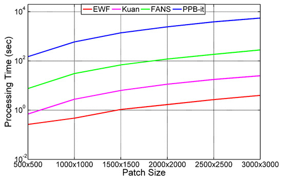 Finally, based on the fast processing time characteristic, we evaluated the graph highlighted in Figure 22, together with the values reported in Table 5, which describe the evolution of the processing time used during the filtering process of: Kuan, PPB-it, FANS, and EWF, while varying the Sentinel-1 SAR image patch size. By proceeding with this analysis, we can confirm that our proposed filtering algorithm EWF was always faster than both non-local approaches and the Kuan filter in terms of computational time in the processor with a large time difference achieved while increasing the patch size of the Chicago City Sentinel-1 SAR data. This point is very interesting for this study due to the dimensions characterizing Sentinel-1 data. In fact, EWF demonstrated that it was able of filtering a large Sentinel-1 SAR image in a reduced time, much less than all non-local approaches, with a good performance at removing speckle noise and a considerable edges and image detail preservation, better than the spatial approaches. It is important to highlight that the proposed GPU-based approach can guarantee a reduction of approximately 14-times the processing time compared to the same algorithm implemented on a CPU. This is due to the particular design and implementation of the algorithm using functions well suited for a GPU, such as the 2D FFT and IFFT.